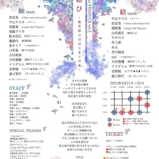 『引き結び -紬ぎ結ぶははじまりの糸-』 作・演出 湯口智行(ポンポンペイン) 主宰:ViStar 日時:2021年4/21(水)~25(日) 会場:池袋 BOX in BOX THEARTE チケット:VIPシート5500円(各回13席限定) 全席自由席・前売りシート 4000円 詳細:https://twitter.com/takaokidesuyo チケットフォーム(岡扱い) https://ticket.corich.jp/apply/111322/008/